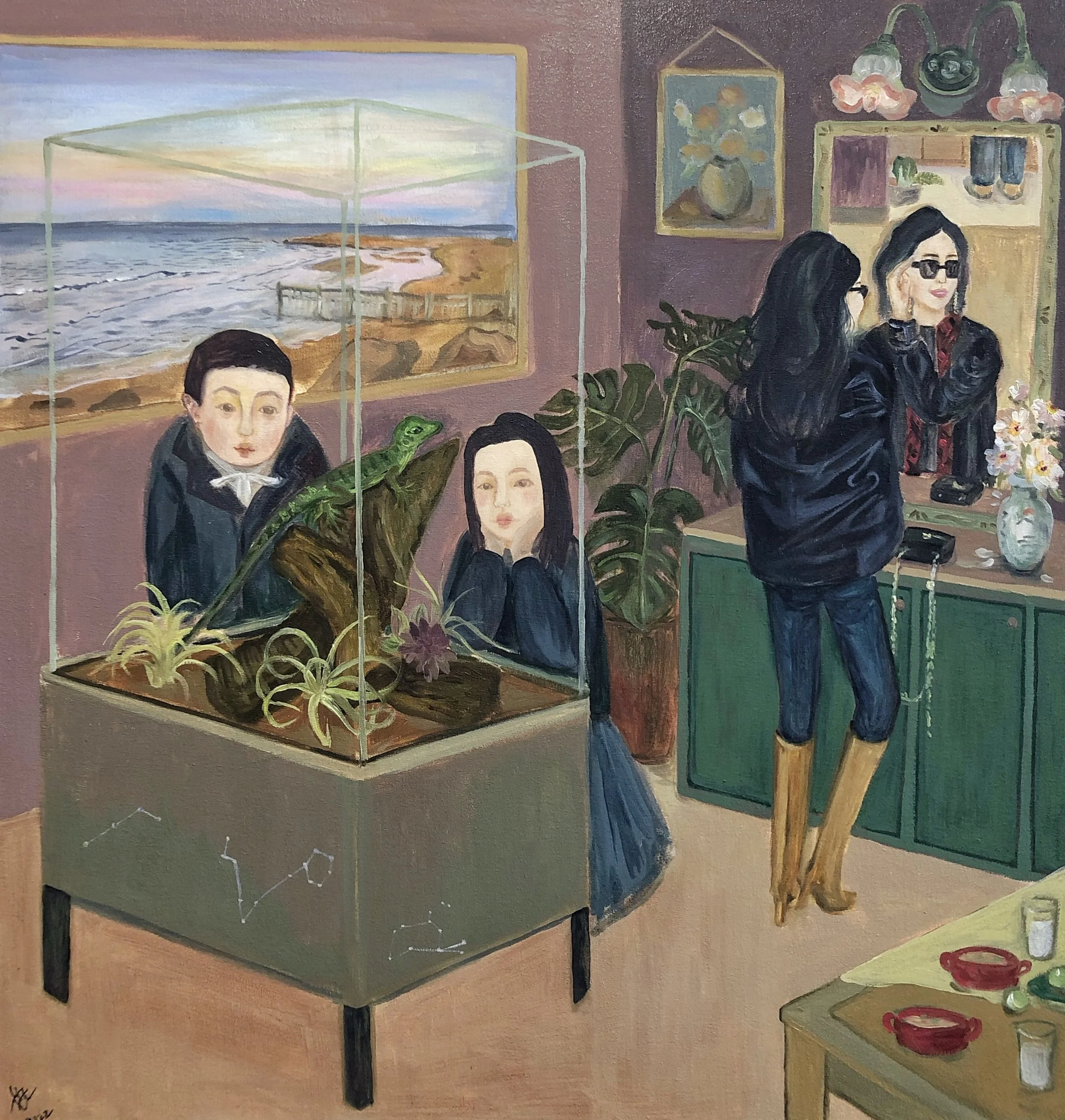 I place the relatives I know from real life into completely unfamiliar spaces that I construct myself. This unfamiliarity directly reflects the sense of estrangement that still exists between family members, despite our blood ties. My aunt, who is obsessed with beauty, my much younger cousins, and my uncle, who feels the most distant in that family, are all present. Even though he was dating my aunt when I was born and I saw him often, I still feel very distant from him. He’s also in the painting, but tucked away in the top right corner of the kitchen. After seeing the painting, he pretended to be upset, saying I was treating him differently. I just smiled and didn’t say anything.
