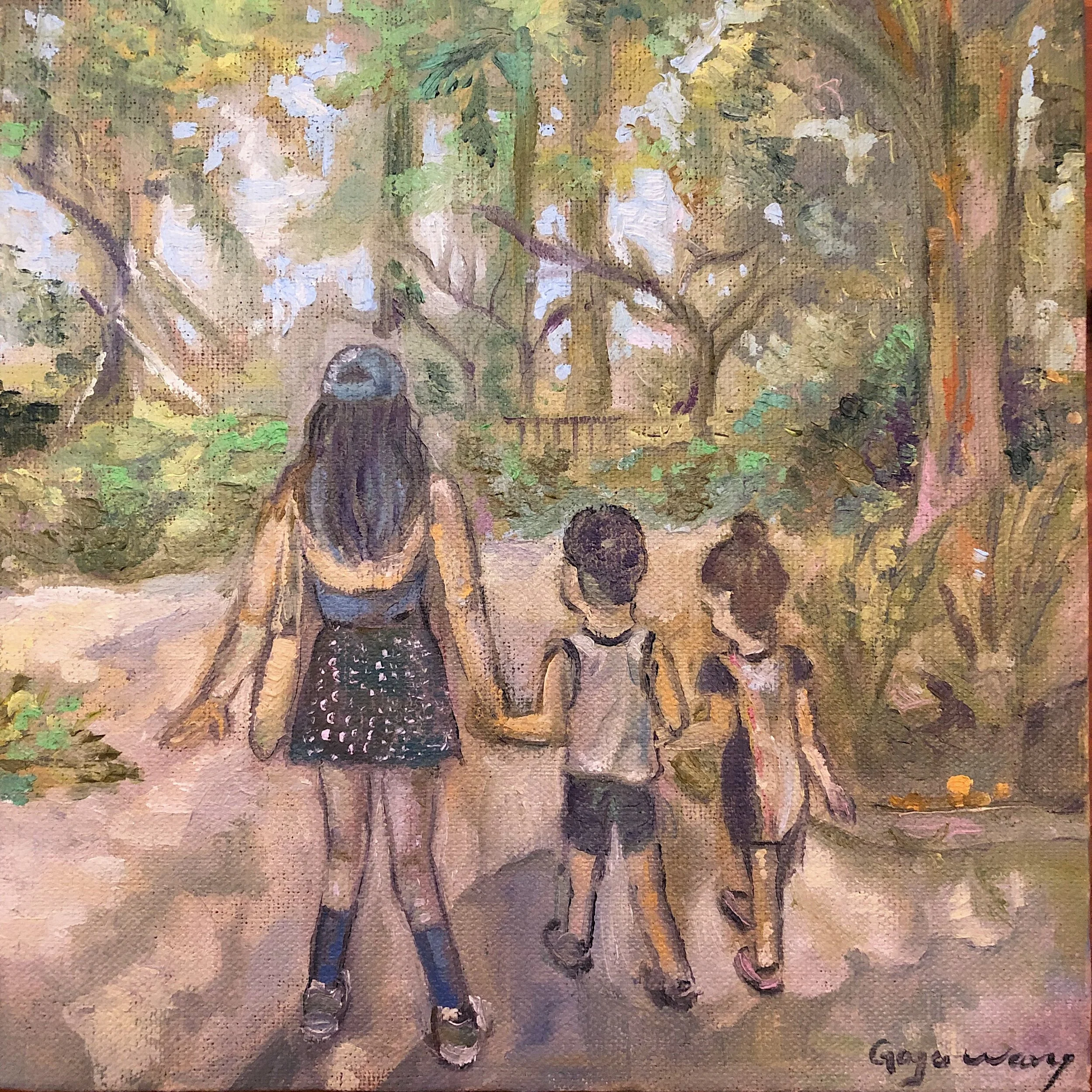 For her birthday, I always gift her my paintings, often of flowers and birds. However, in the past two years, I’ve chosen to depict her family life as a gift. The first time I did this, I painted from a photo, capturing sunlight, shadows from trees, and the figures' poses without much alteration. After that, I began experimenting with a more intentional approach to composition.